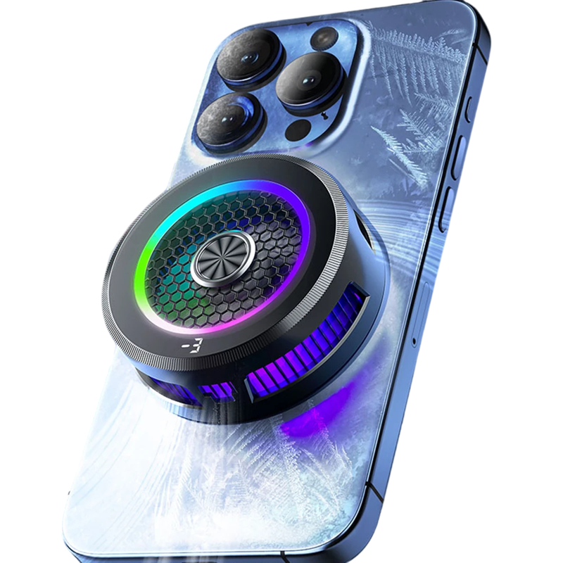 Arrefecedor de telefone potente com 3 modos, luzes RGB e gerador de gelo que refrigera rapidamente o dispositivo durante jogos, trabalho ou entretenimento. Descrição completa