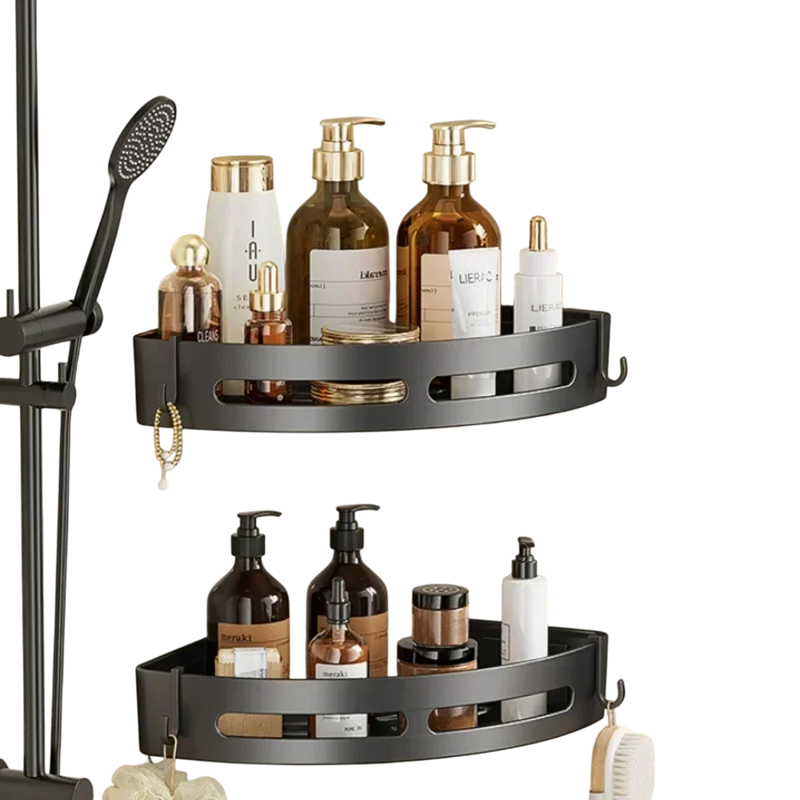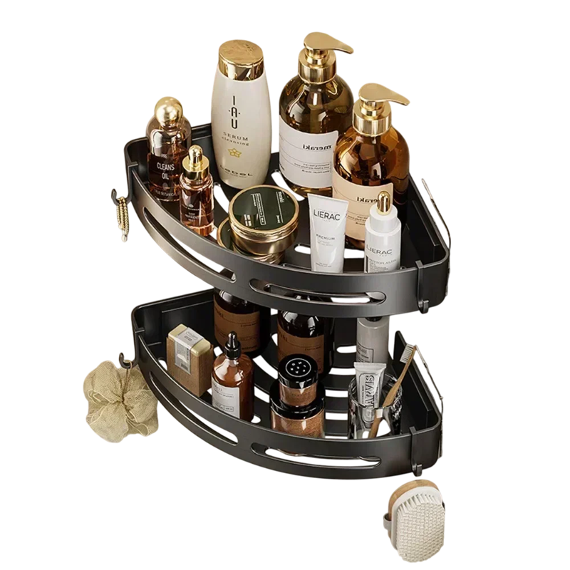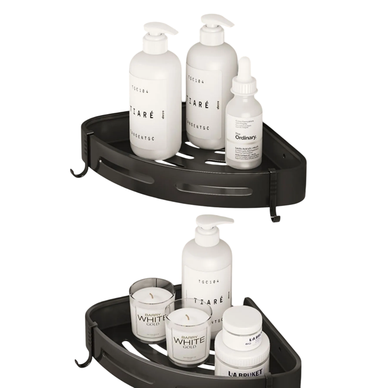 Conjunto de duas prateleiras de canto para casa de banho com montagem adesiva sem perfuração. Economia de espaço, alta capacidade e fácil instalação em poucos minutos. Descrição completa