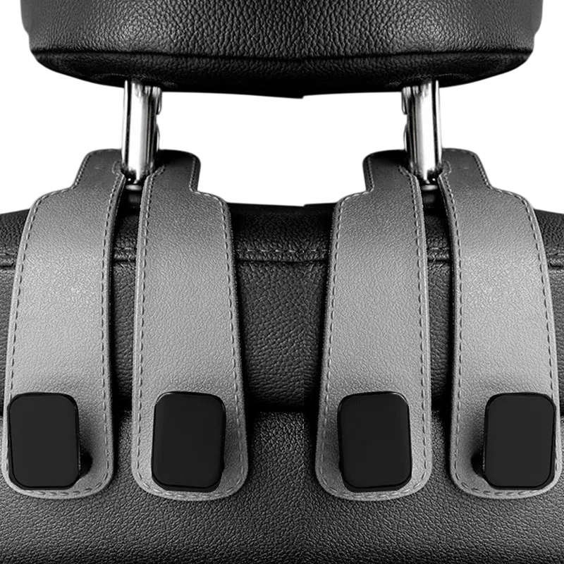Conjunto de dois ganchos práticos para pendurar sacos, carteiras ou sacos de compras no apoio de cabeça, economiza espaço e mantém a ordem no carro. Descrição completa