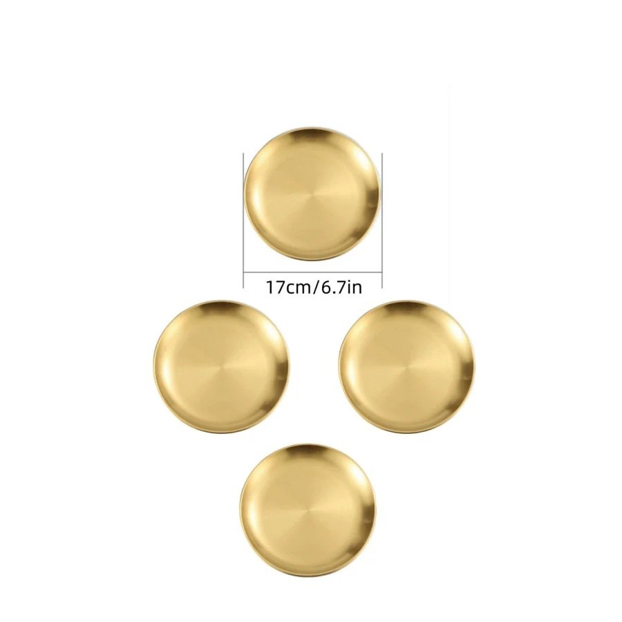 Pratos dourados elegantes de aço inoxidável com 17 cm de diâmetro são ideais para sobremesas, entradas, pratos pequenos e refeições festivas. Descrição completa