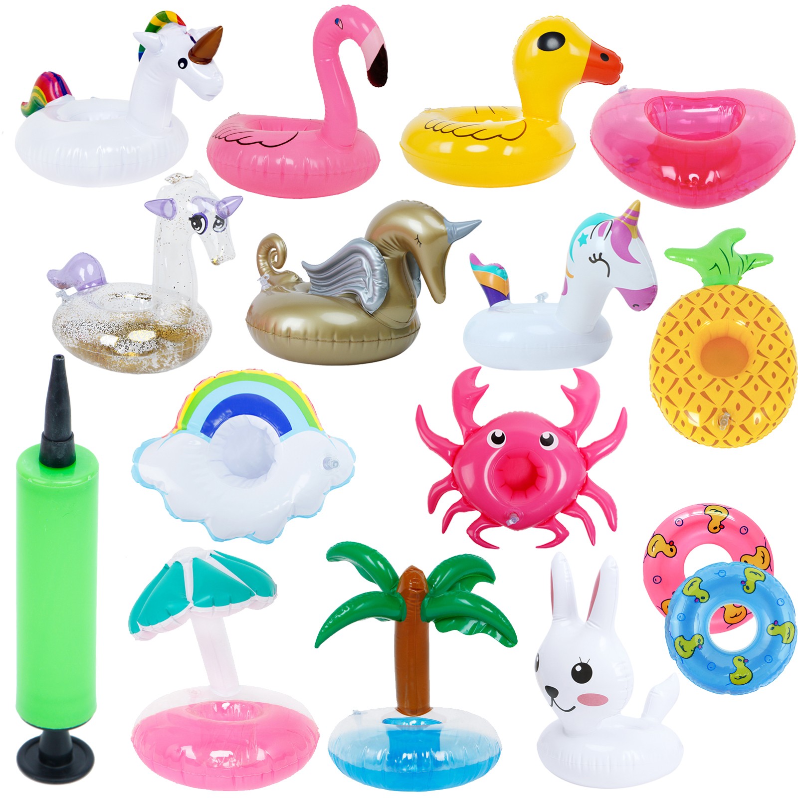 Escolha um anel insuflável de muitos motivos não convencionais. Também está disponível uma bomba para fácil insuflação.