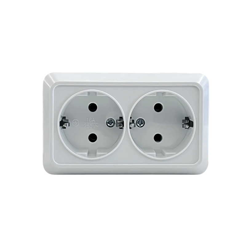 Adaptador exterior duplo com aterramento para uso seguro. Plástico não inflamável, potência 220V/16A, ideal para uso doméstico universal. Descrição completa