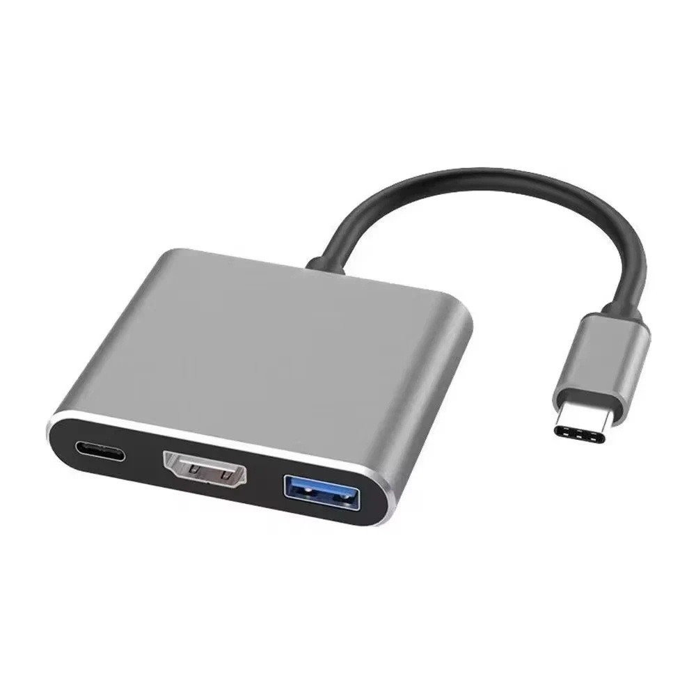 Adaptador USB-C 3 em 1 universal com HDMI 4K, USB 3.0 e USB-C PD 100W para ligação de monitor, periféricos e carregamento de notebooks, tablets e telemóveis. Descrição completa