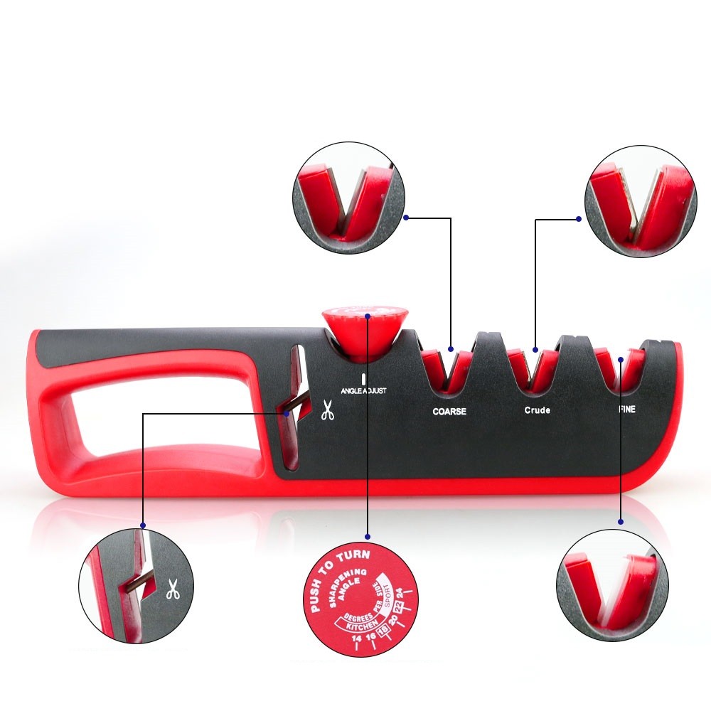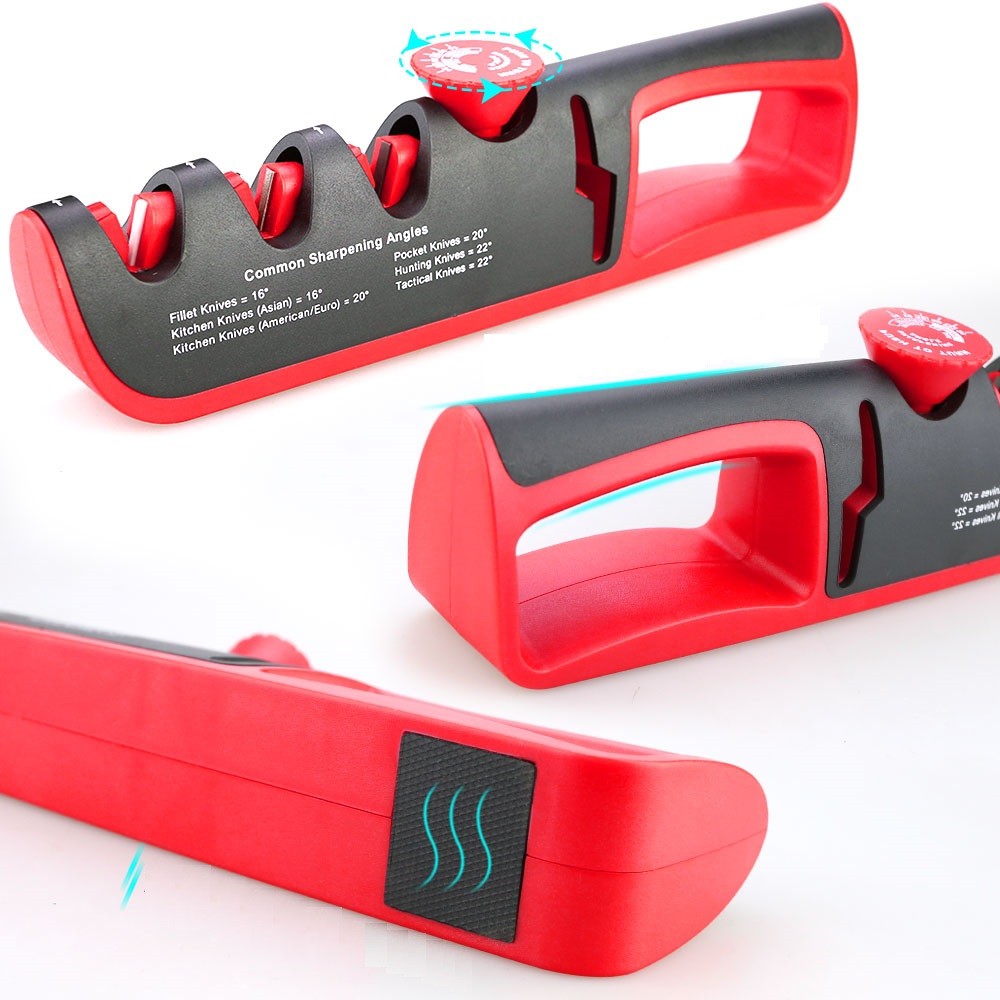 O ângulo de afiação pode ser ajustado através do botão rotativo superior.