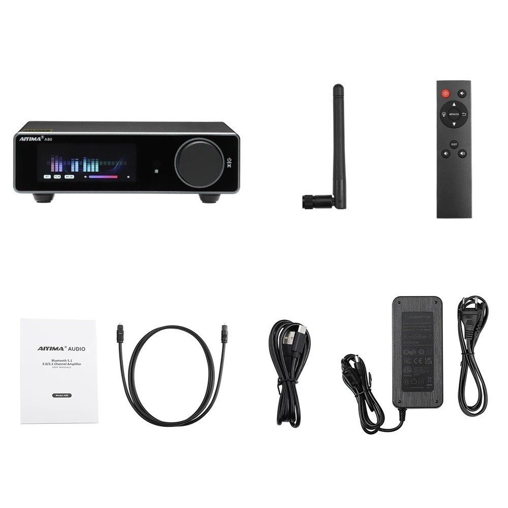 O amplificador A80 é um dispositivo profissional digital Hi-Fi com conversor DAC integrado e ampla conectividade. Suporta Bluetooth 5.1 com codecs aptX HD, USB, RCA, TRS, entrada óptica e coaxial. Graças aos chips TPA3255D2 e ESS9038Q2M, oferece som extremamente limpo, suporte a DSD256 e PCM 384kHz/32bit e potência de saída de até 2x 300 W (4 Ω). O corpo metálico compacto, o display colorido e o controlo remoto incluído complementam a aparência e as funções profissionais. Adequado para sistemas estéreo 2.0 e 2.1 (subwoofer ativo).