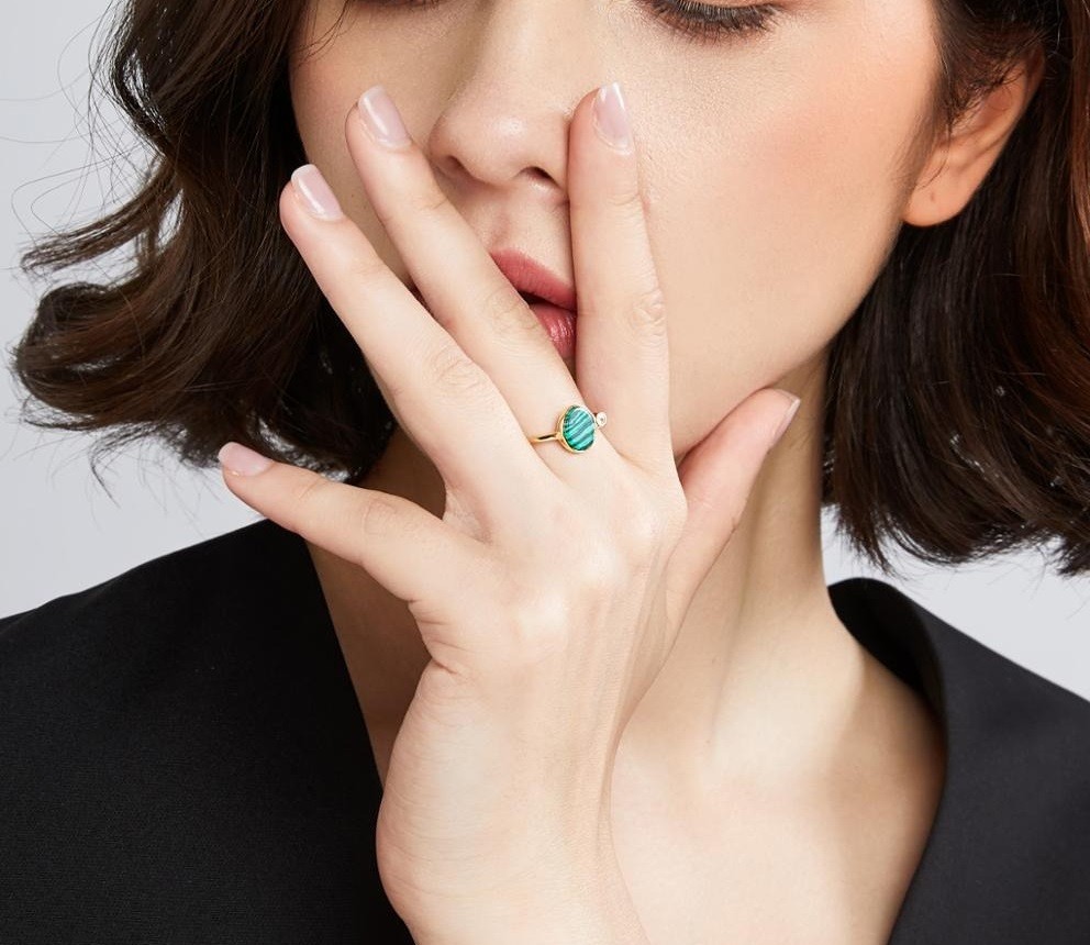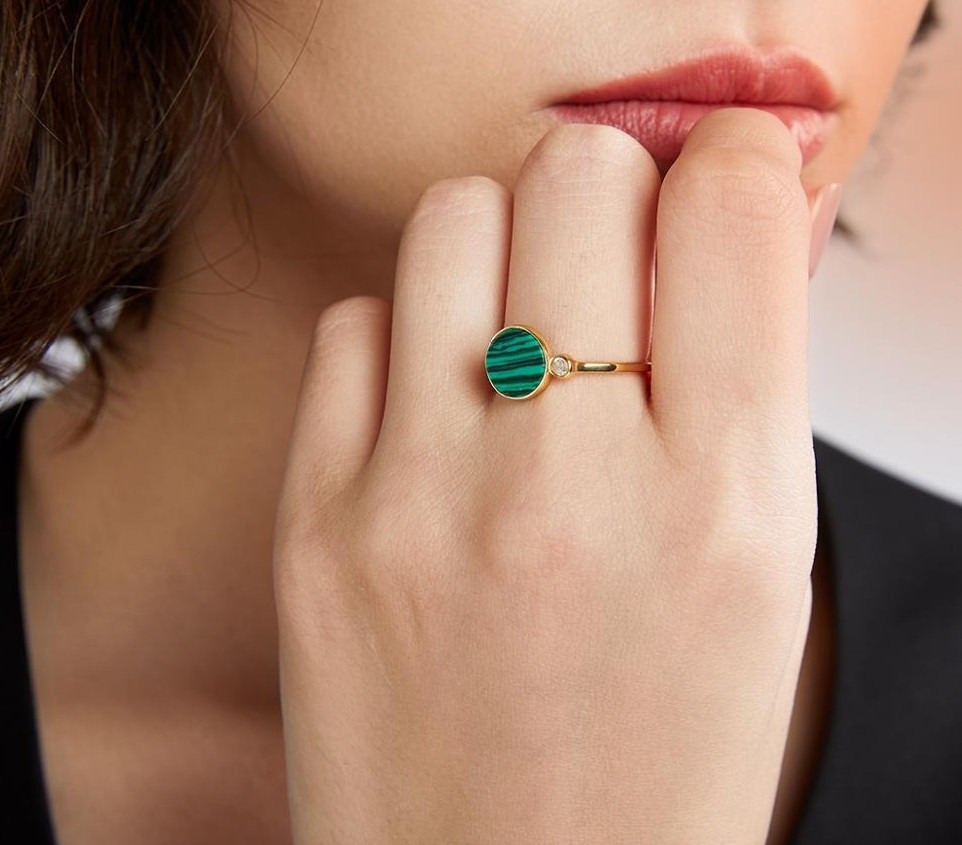 Material: metal de bijuteria, zircão, imitação de malaquita
