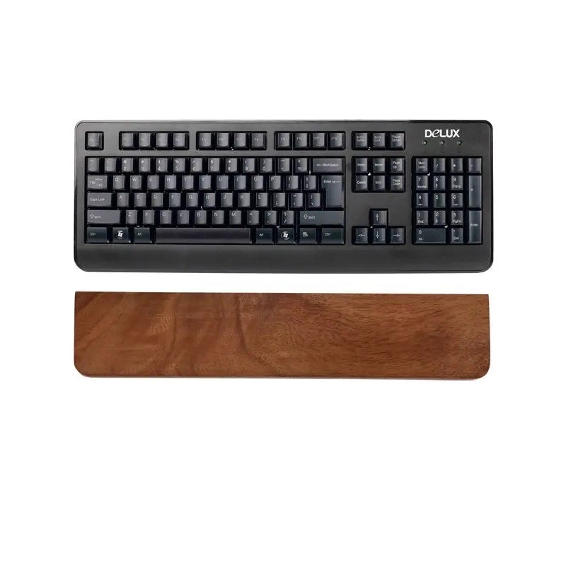 Apoio de pulso estiloso em madeira maciça para uma digitação confortável, melhor ergonomia das mãos e suporte estável durante o trabalho. Descrição completa