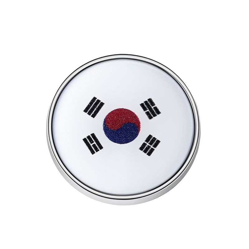 Autocolante da bandeira da Coreia com borda metálica e diâmetro de 2,8 cm. Fixação firme e rápida.