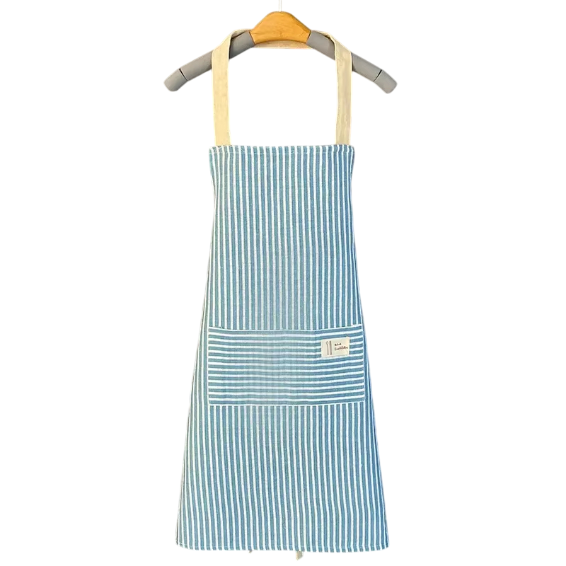 Avental leve de linho que protege a roupa ao cozinhar ou trabalhar no jardim, confortável, durável e estiloso com riscas elegantes. Descrição completa