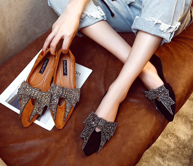 Estas balerinas elegantes com laço parecem perfeitas. O laço é feito de pedras brilhantes.