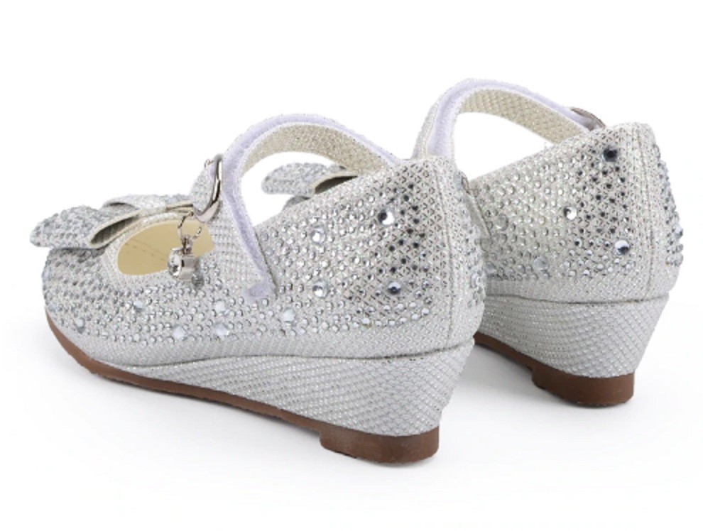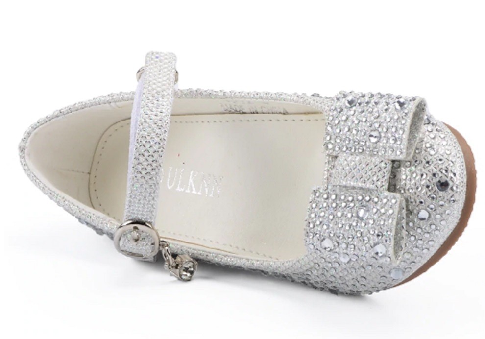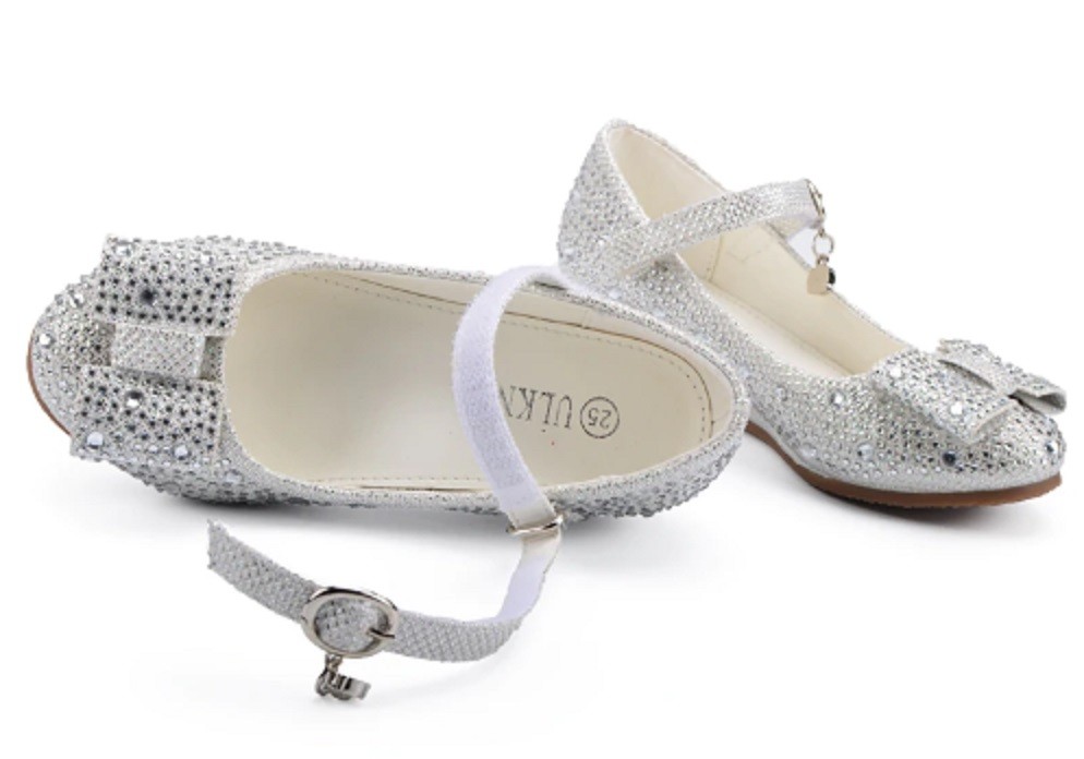 As balerinas são adornadas com pedras e têm uma tira sobre o peito do pé com fecho de velcro.