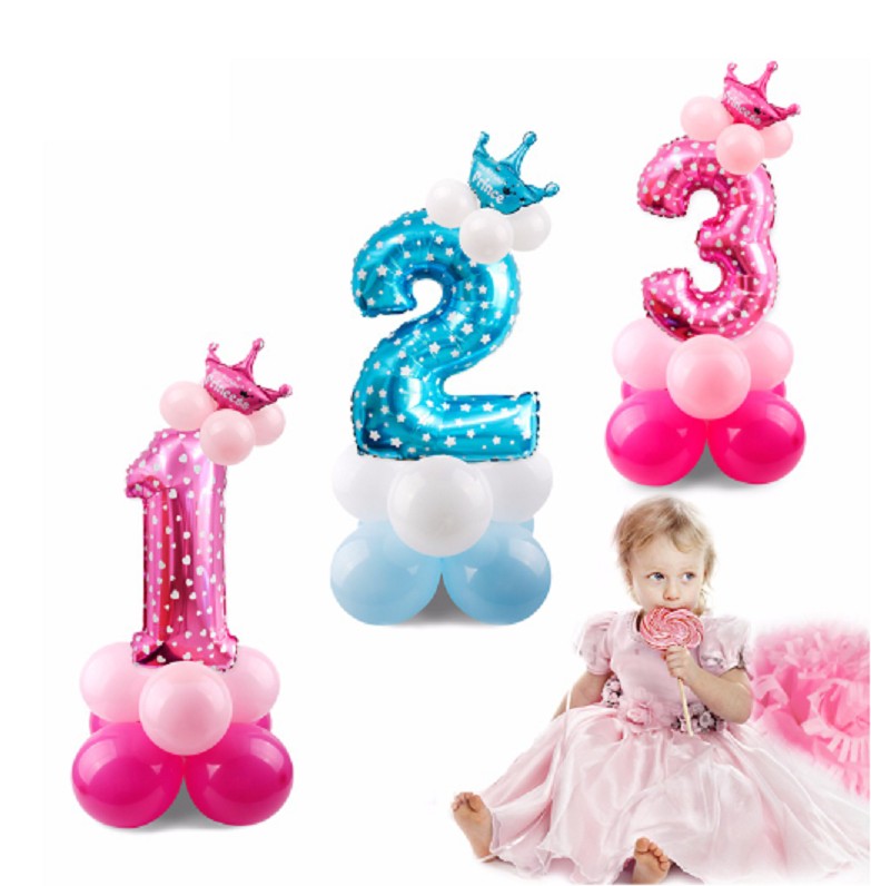 O balão em forma de número pode ser preso a vários balões pequenos e em cima pode colocar uma coroa.