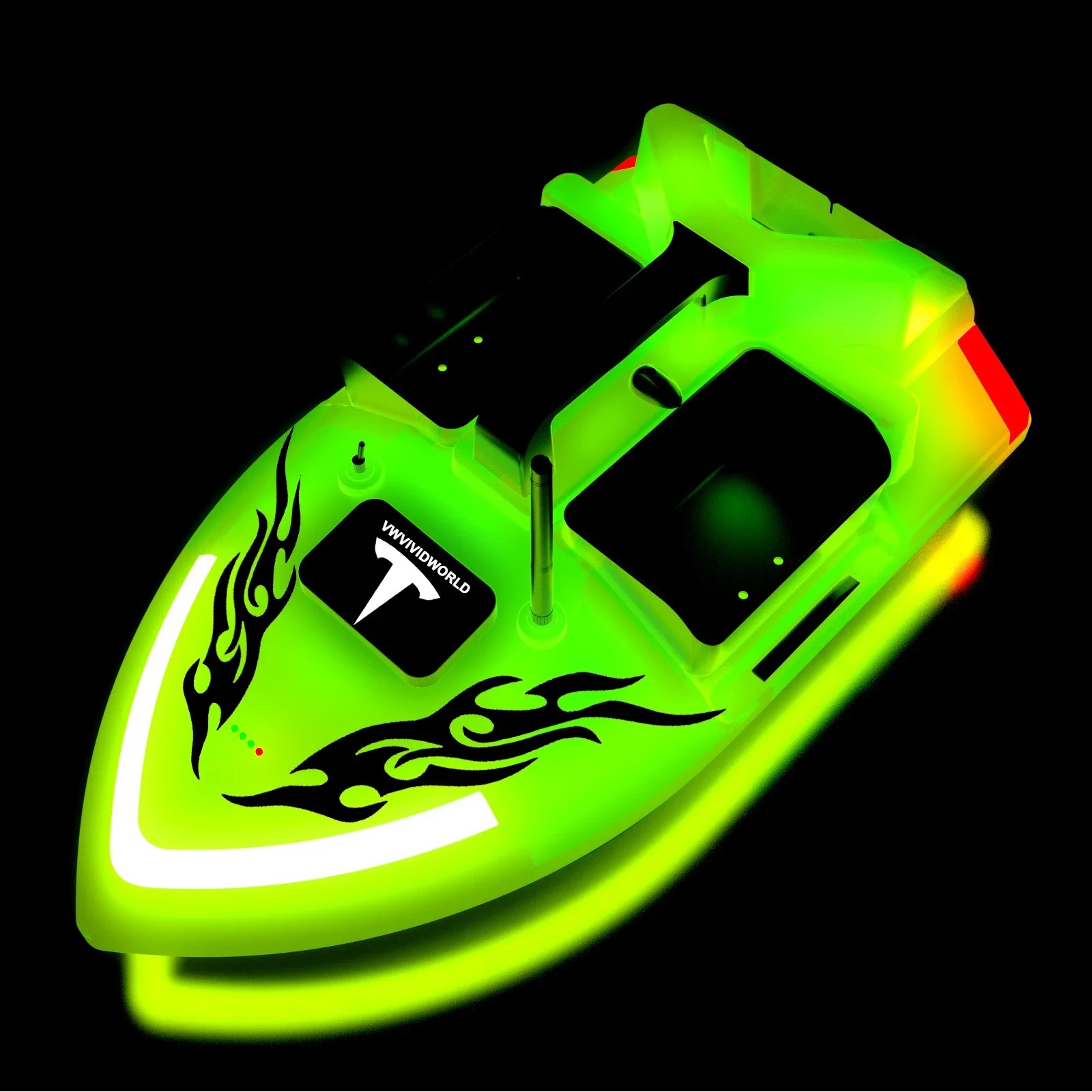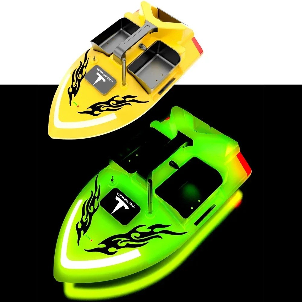 A disposição de três câmaras dos compartimentos permite dividir a alimentação e trabalhar com ela conforme necessário. A parte traseira é projetada para que seja possível transportar o anzol com segurança e, em seguida, liberar a linha, o que reduz o risco de emaranhamento. O acionamento é garantido por dois motores com hélices de três lâminas para uma navegação suave e boa manobrabilidade. Uma função de segurança prática é o retorno automático em caso de baixa carga da bateria ou perda de sinal e também ao ultrapassar o alcance. A distância máxima de controlo é até 500 metros, o que cobre a maioria das situações comuns na água. As luzes LED facilitam a orientação e o controlo da direção durante a pesca em condições de pouca luz ou à noite.