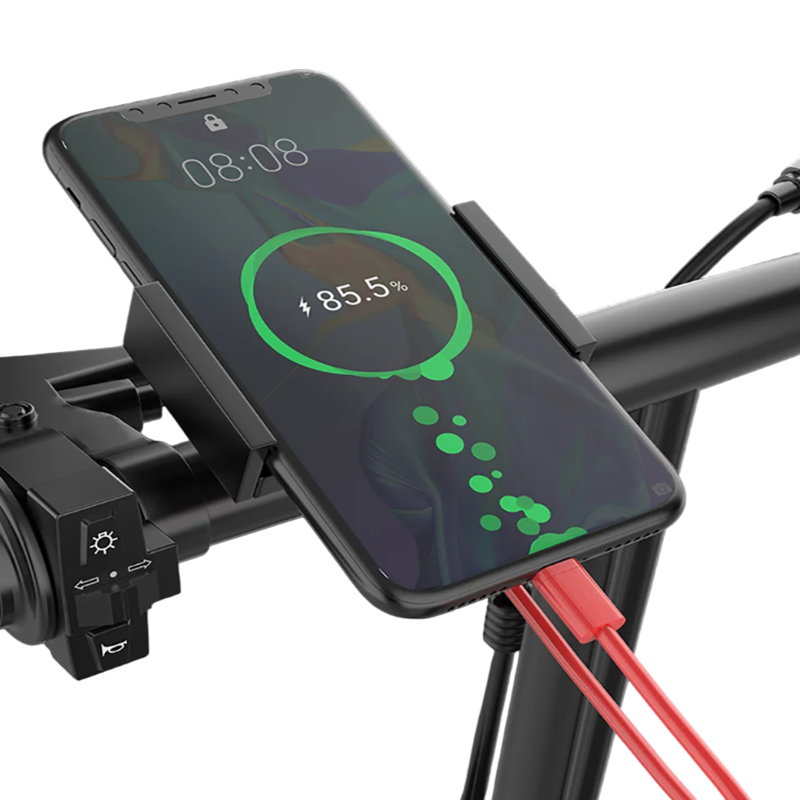 A bicicleta elétrica está equipada com dois assentos confortáveis, permitindo o transporte de um passageiro. Para melhor orientação durante a condução à noite, não falta a luz LED, enquanto a buzina aumenta a segurança em trânsito urbano denso. A suspensão garante uma condução confortável mesmo em estradas irregulares. Um acessório prático é o suporte para telemóvel, que permite acompanhar a navegação ou atender chamadas de forma segura.