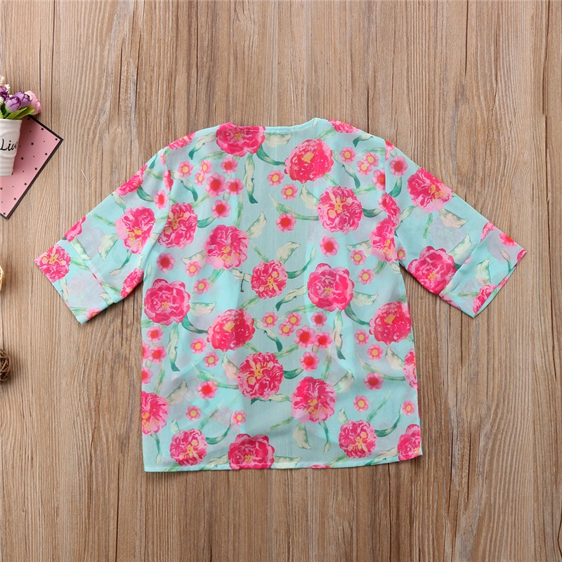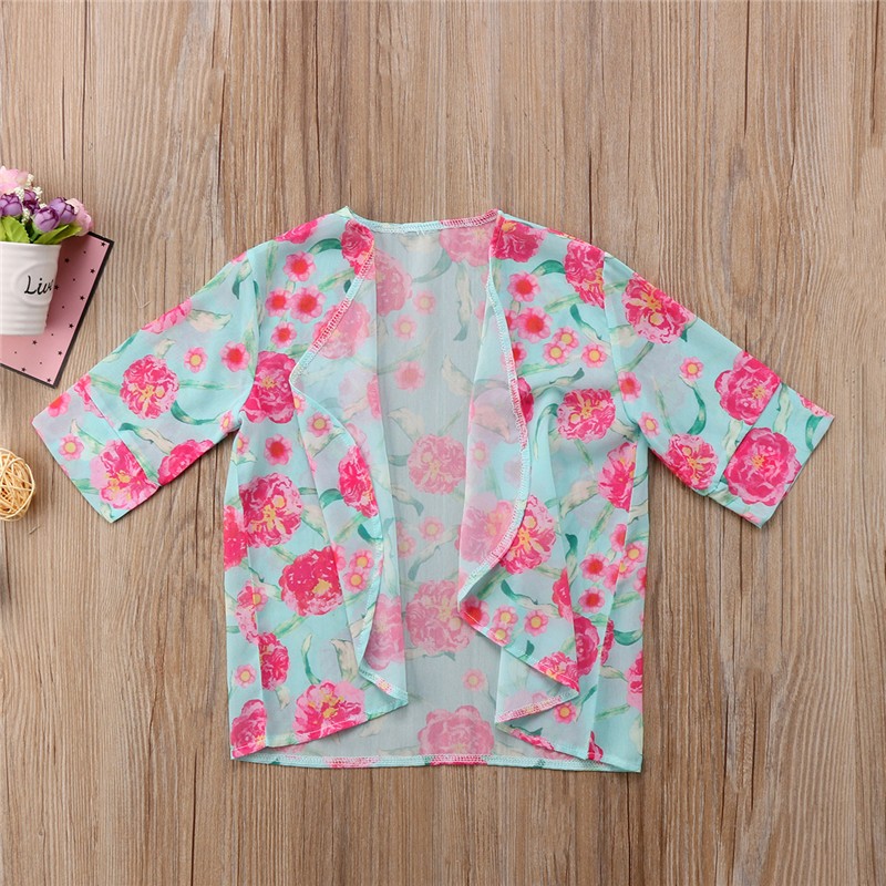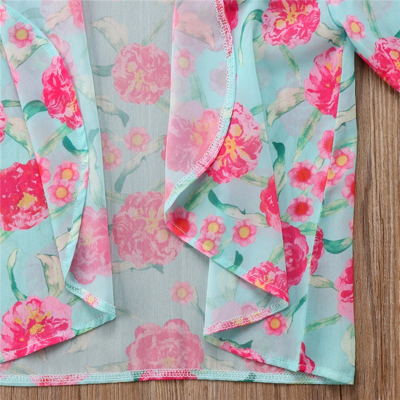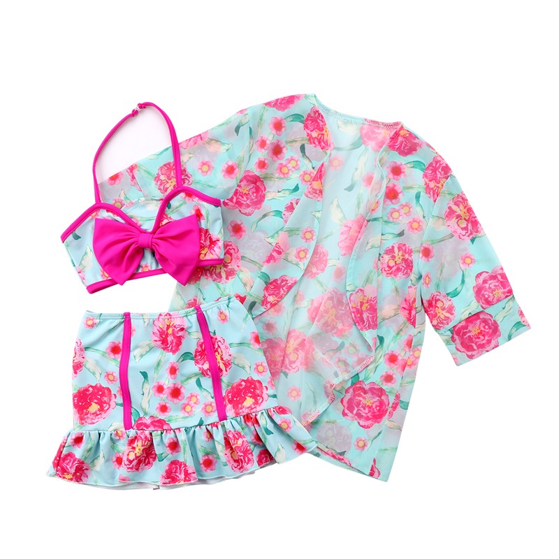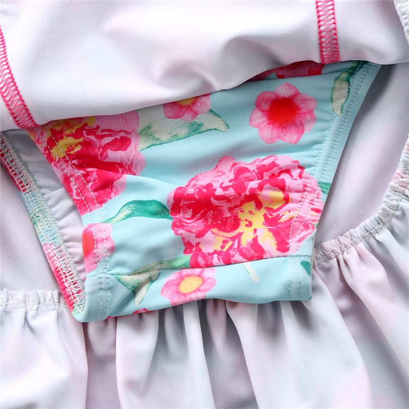 Belo biquíni de menina com flores, decorado com um laço na parte de cima.