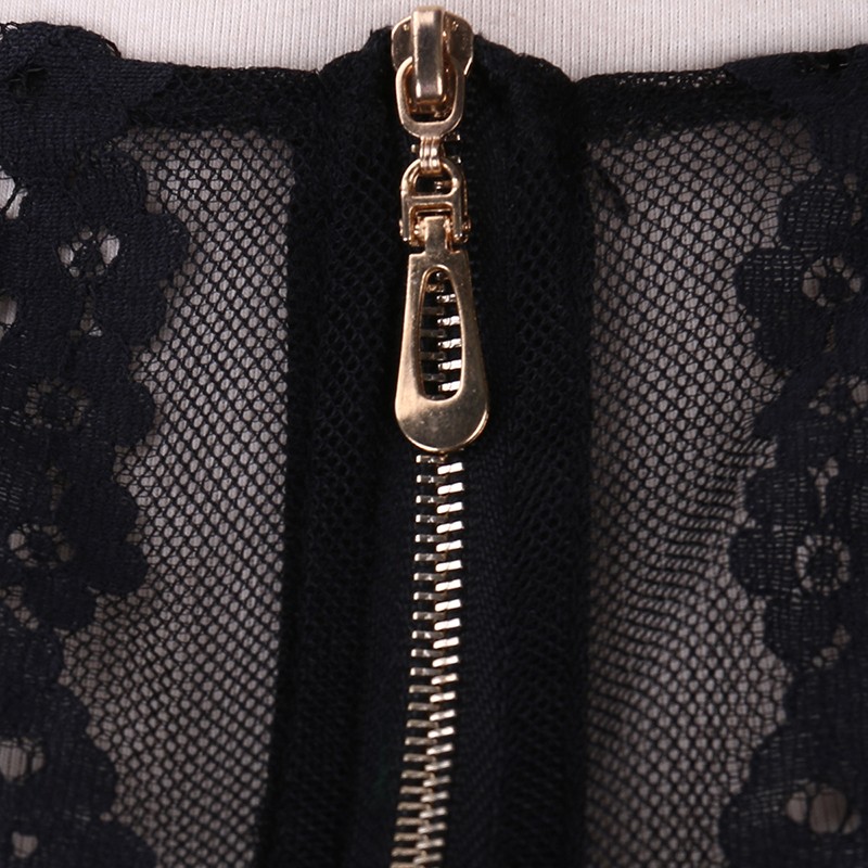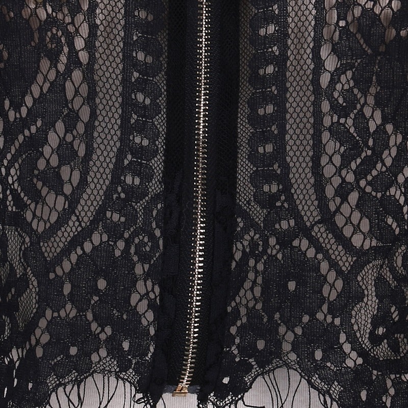 É toda em renda, com mangas longas e fecho na parte frontal.