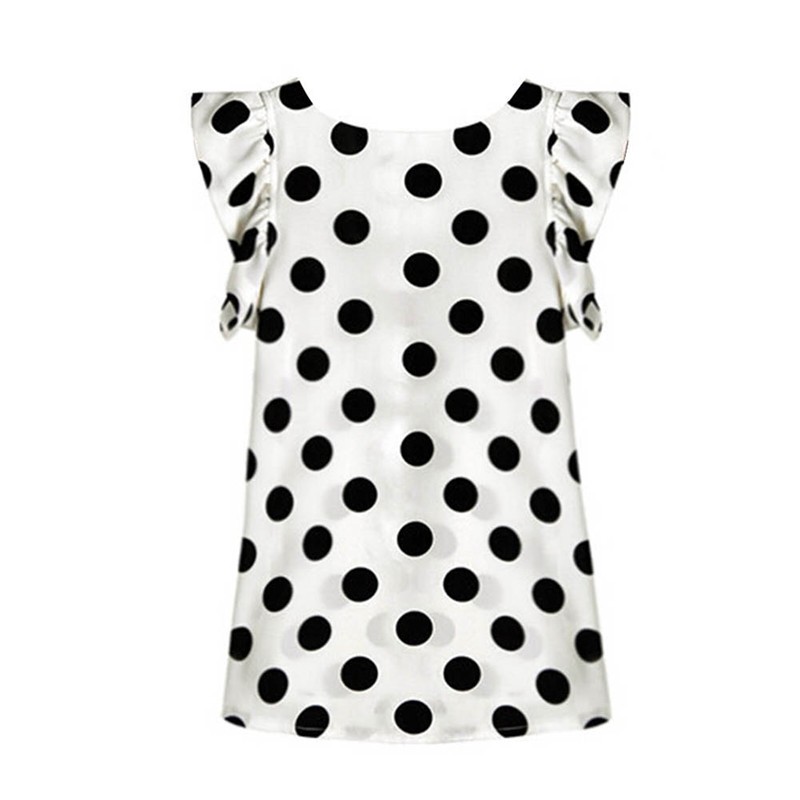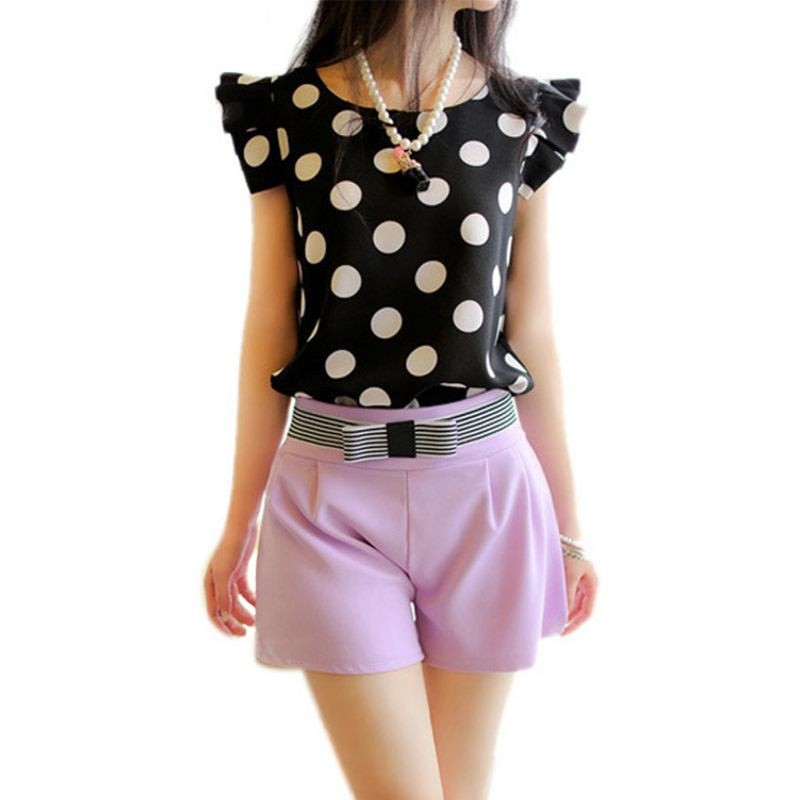 Linda blusa com bolinhas. Tem mangas curtas, nas quais há volantes.