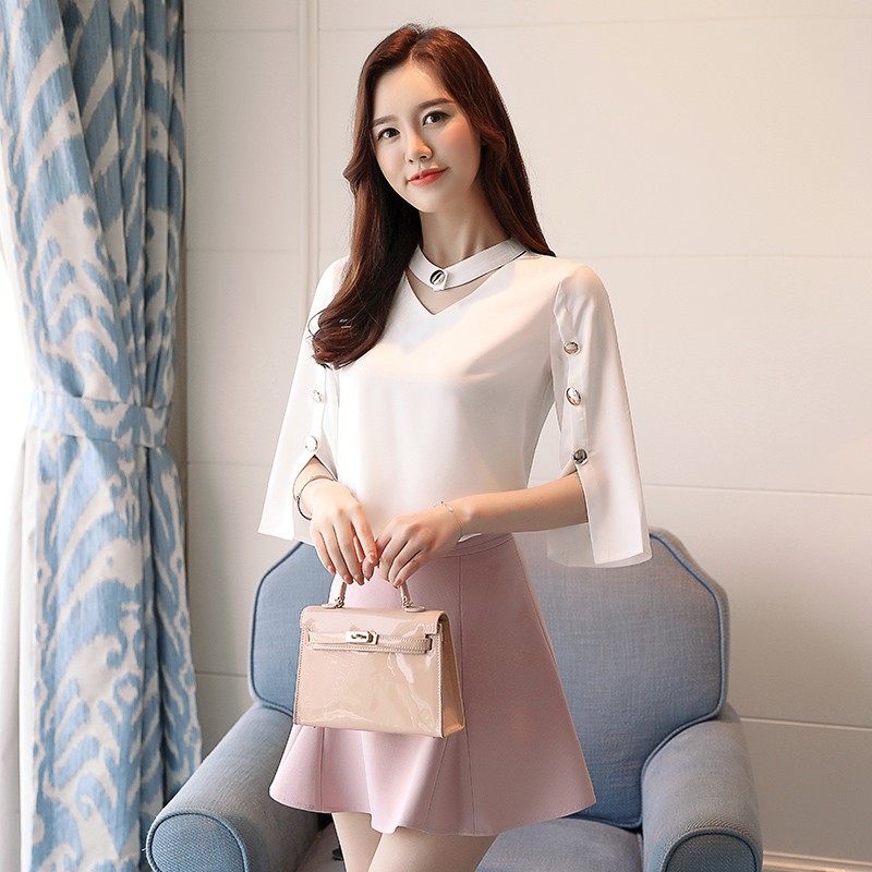 Possui mangas de três quartos com aberturas decoradas com botões dourados.