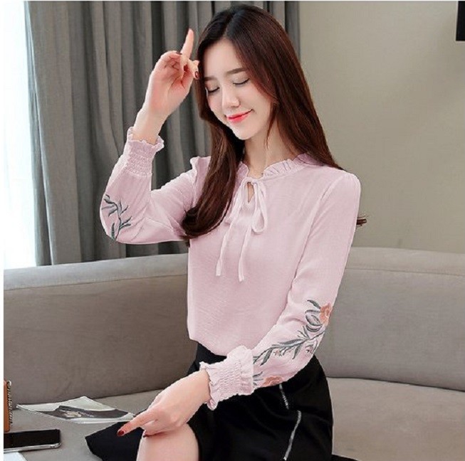 Nádia blusa com laço no colarinho e padrão floral nas mangas.