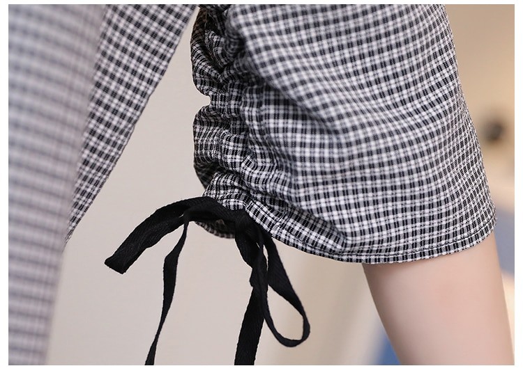 Linda blusa com laço preto e padrão xadrez.