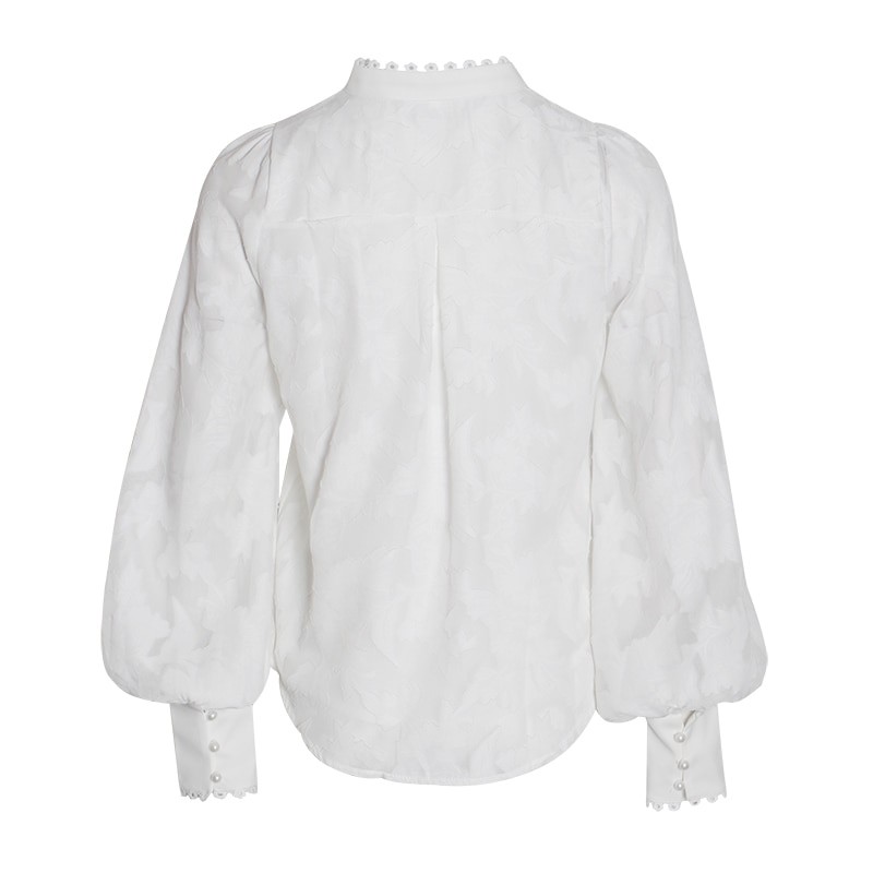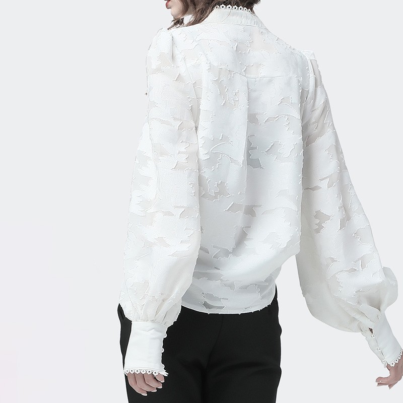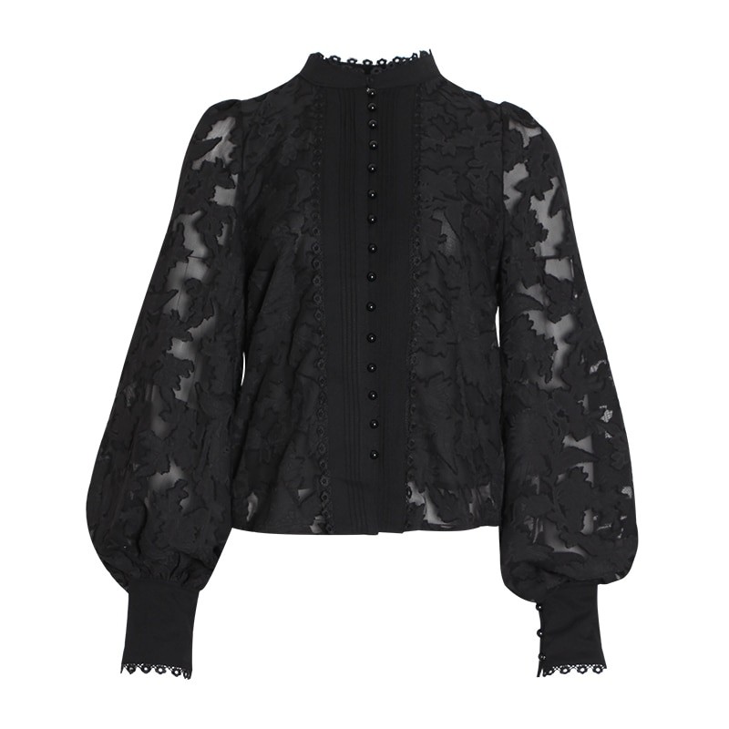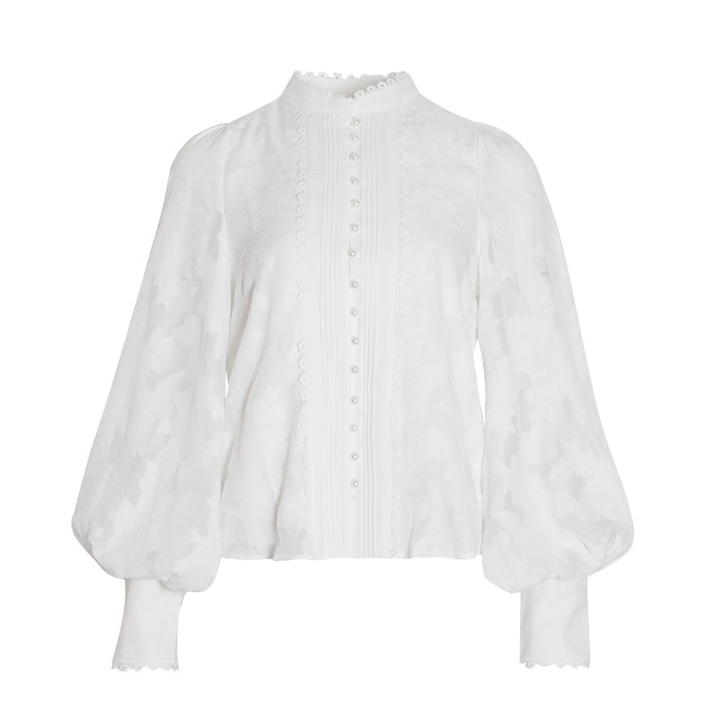 Mangas longas e bufantes com diversos padrões ao longo de toda a peça.