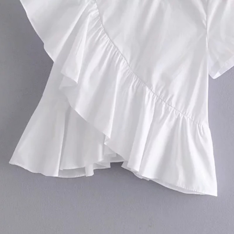 Esta blusa é adornada com volantes desde a manga até ao lado.
