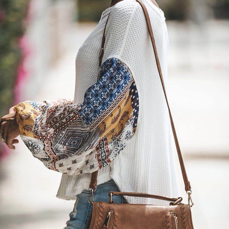Tem mangas longas e soltas, que possuem um padrão estiloso.
