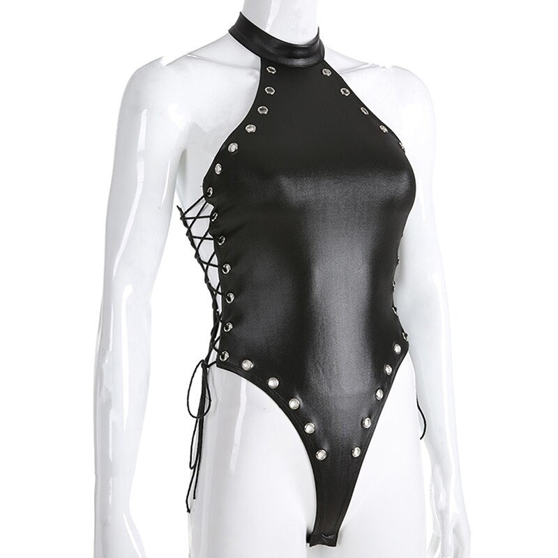 Body de couro preto para mulheres