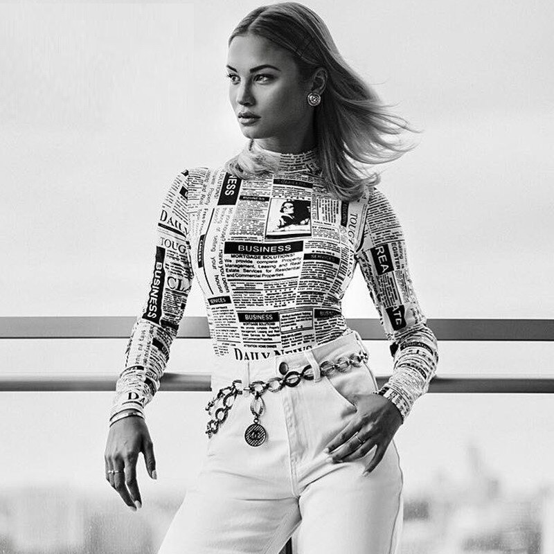 Body feminino com padrão de jornais