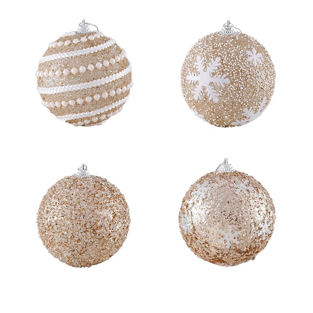 Veja estas lindas bolas de Natal douradas! São fornecidas em conjunto de quatro. Cada bola tem o seu próprio aspeto distinto. As bolas têm um cordão, para que as possa pendurar no ramo da árvore. Ficam ótimas como decorações interiores ou exteriores e as purpurinas e pedras dão-lhes o brilho certo.