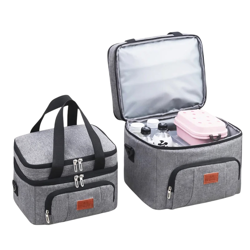Prática bolsa térmica de duas camadas com compartimentos separados e aparência neutra mantém os alimentos frescos, ideal para passeios, trabalho e escola. Descrição completa