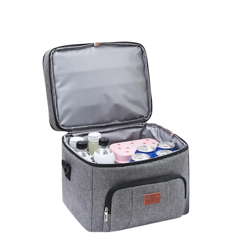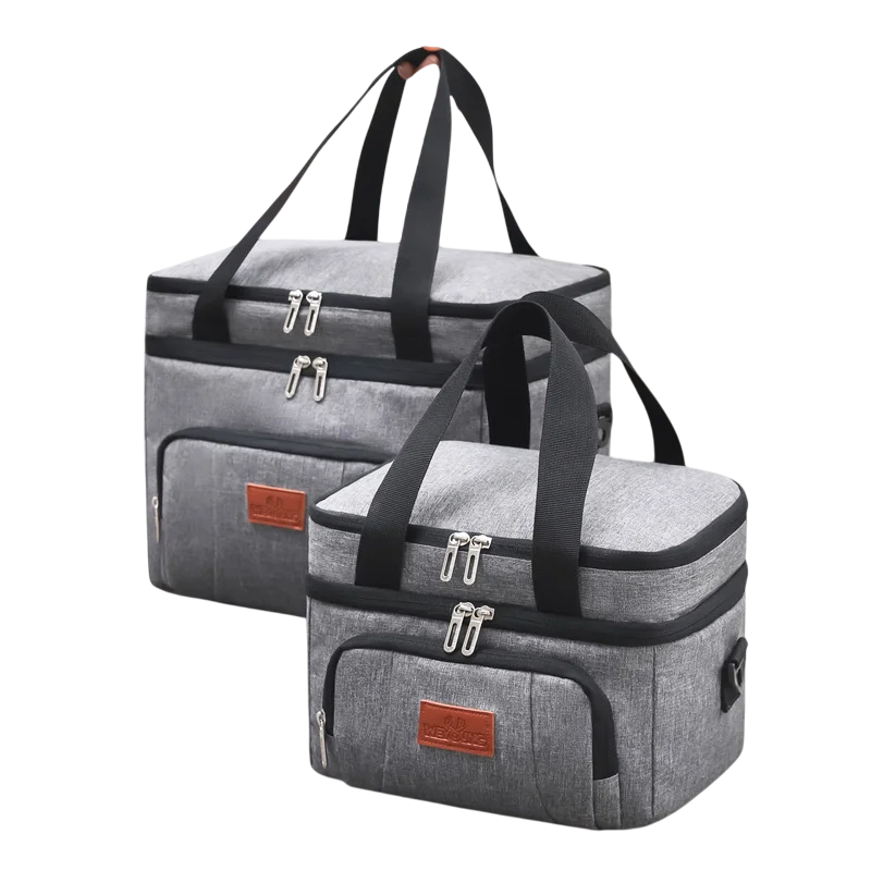 Bolsa térmica de duas camadas espaçosa com design neutro oferece armazenamento eficiente da temperatura dos alimentos, ideal para piqueniques, compras ou viagens. Descrição completa