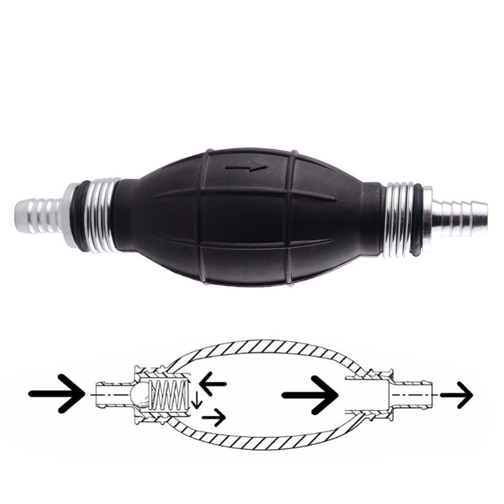Excelente ajuda para transferir combustíveis de um bidão para o carro. Na bomba existe uma seta direcional que indica a direção do fluxo de combustível. Graças à válvula de retenção, o combustível não retorna para o recipiente, mas continua na direção indicada. Durante a manipulação, é necessário bombear continuamente. É útil em qualquer kit de carro.