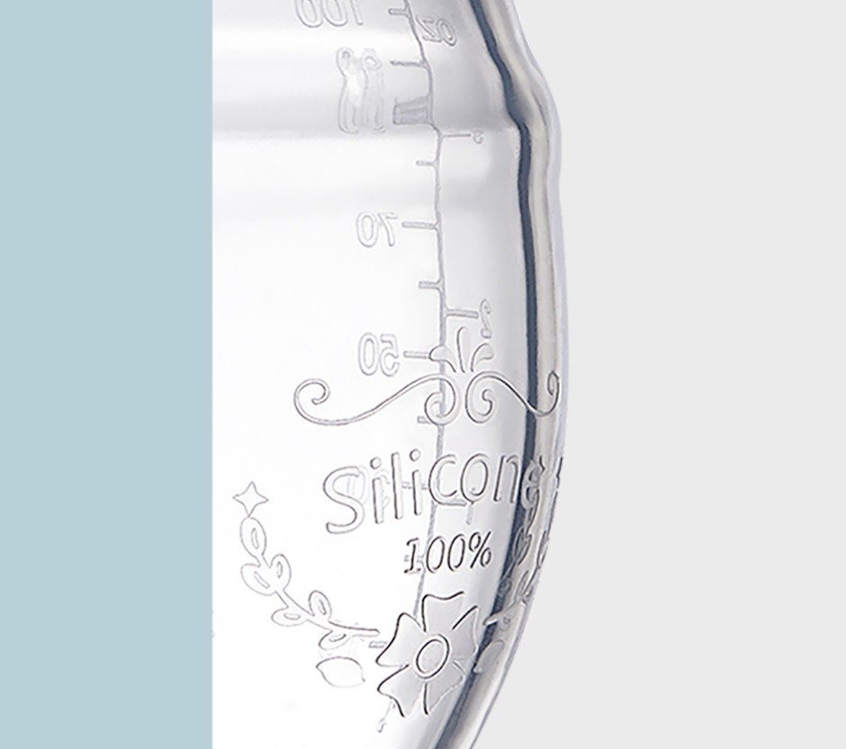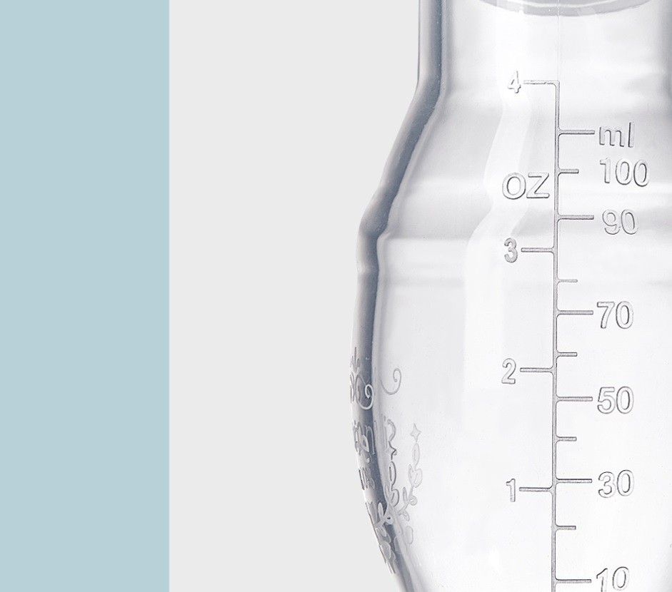 O frasco é decorado com um delicado motivo. O recipiente tem uma marcação prática.