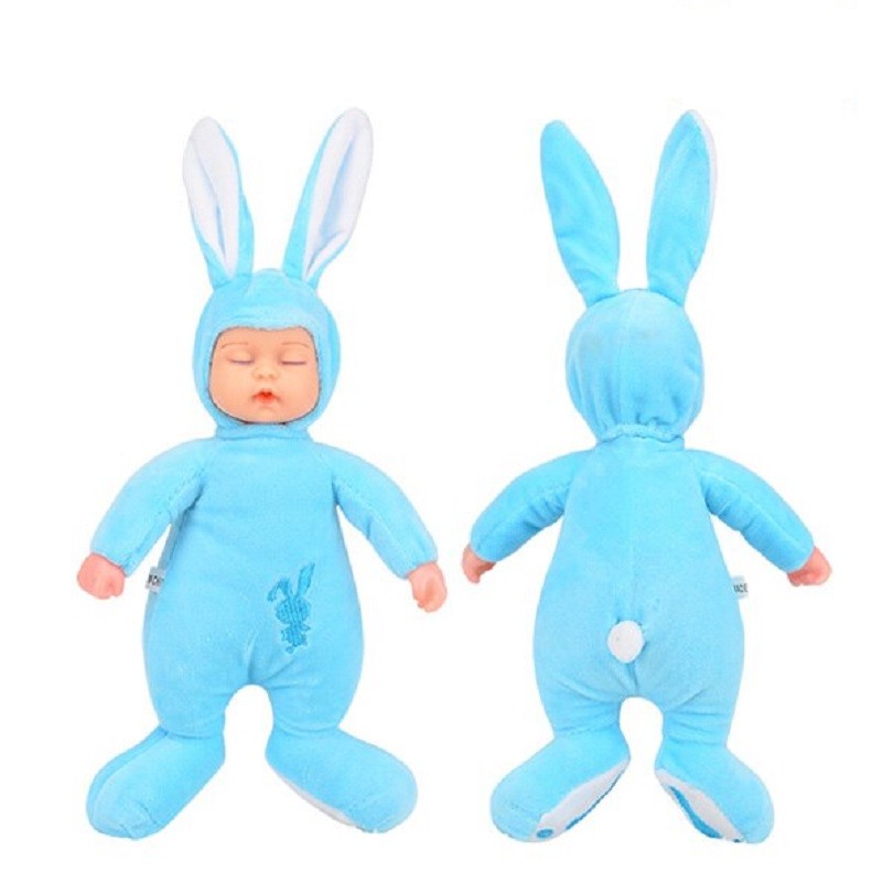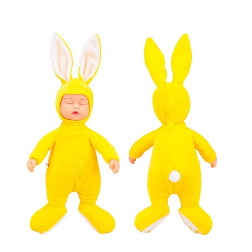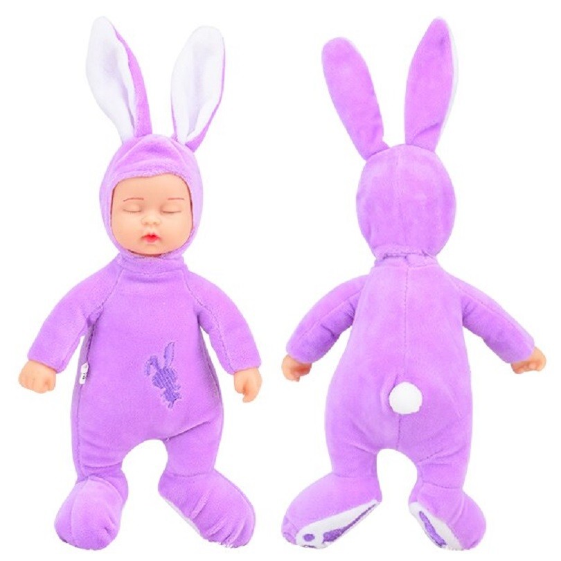 Boneca adorável a dormir com um fato de peluche de coelho.