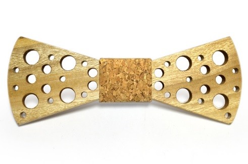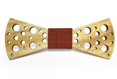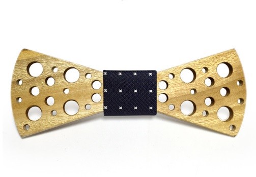 Borboleta de madeira entalhada com tecido decorativo ao centro.