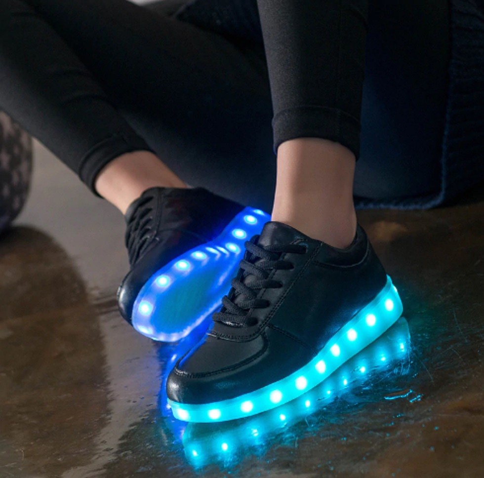 Os ténis têm luzes LED na sola, que mudam de cor.