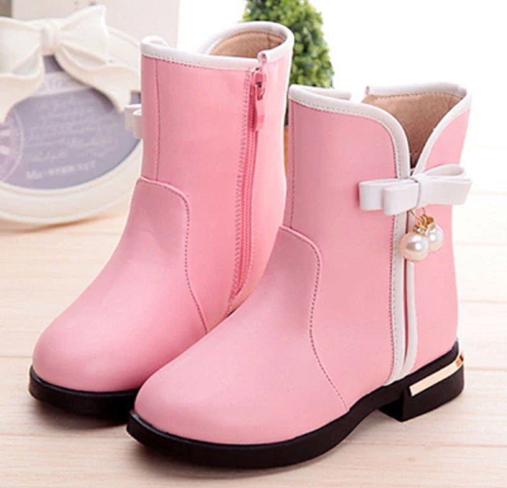 Botas da moda decoradas com laço e pérolas que serão um encanto para qualquer pé de menina.