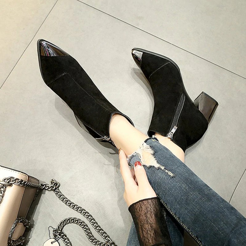 Obteça estas confortáveis botas de tornozelo. As botas têm um salto e biqueira prateados.