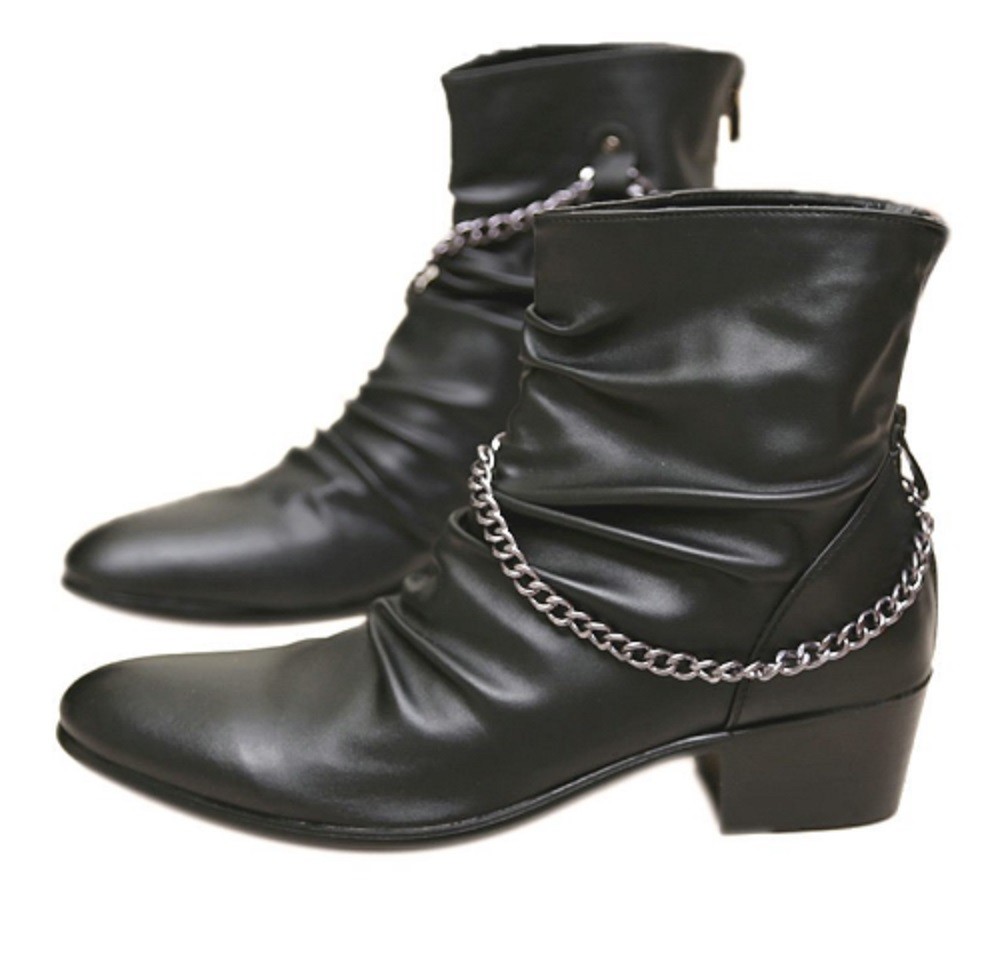 As botas possuem fecho de correr e estão decoradas com uma corrente.