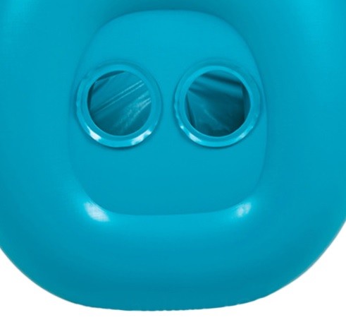 No bote existem aberturas para inserir os pezinhos para a estabilidade da criança e um toldo removível contra o sol.