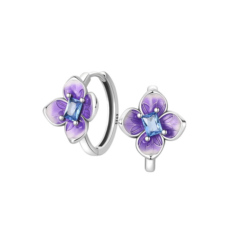Brincos estilosos com design de violetas harmónicas em prata esterlina 925, que se destacam pela delicadeza e elegância. Presente ideal para mulheres. Descrição completa