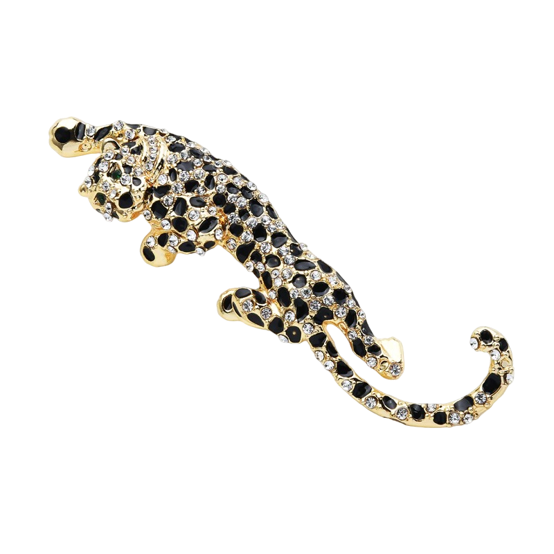 Dê um toque de luxo ao seu visual com este broche de leopardo. É feito de metal de bijuteria e mede 10,4 x 2,6 cm. É um excelente acessório para homens e mulheres.