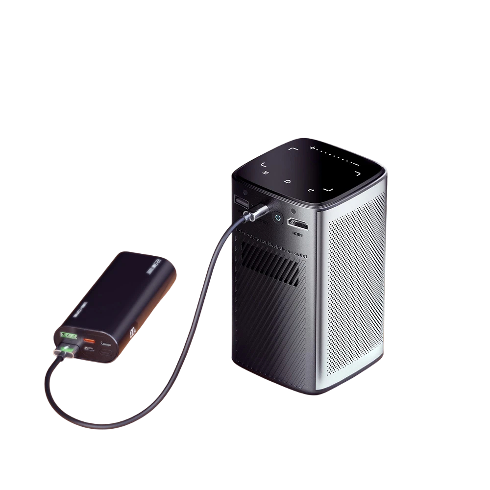 O projetor tem dimensões compactas e pesa apenas 0,5 kg, tornando-o ideal para viagens, para o quarto, sala de estar, mas também para projeções noturnas no jardim ou durante acampamentos. A bateria integrada de 8000 mAh permite várias horas de funcionamento sem fios e carrega-se através do moderno conector USB Type-C.