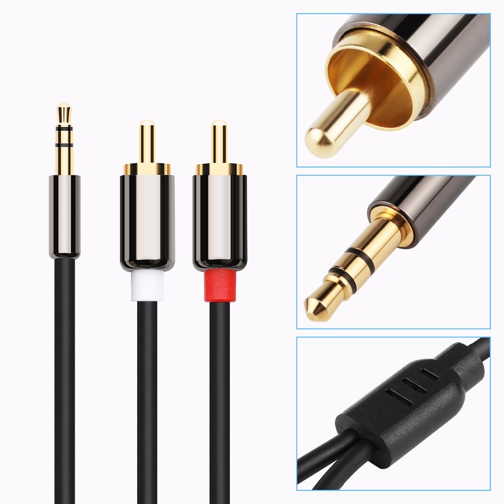 O cabo tem 3 saídas jack de 3,5 mm, um macho de um lado do cabo e 2 machos do outro lado.