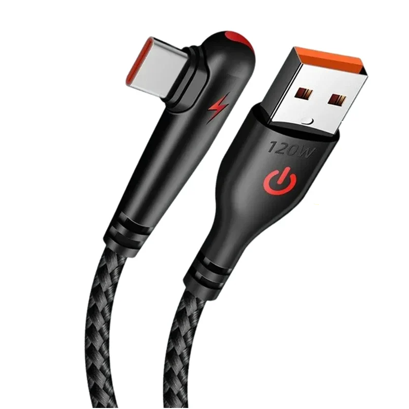 Cabo resistente com conector em ângulo reto, suporte para carregamento rápido 6A e potência de 120 W. Comprimento de 1 m, ideal para casa e para o carro. Descrição completa