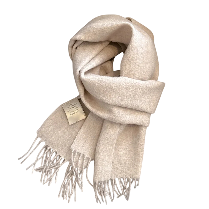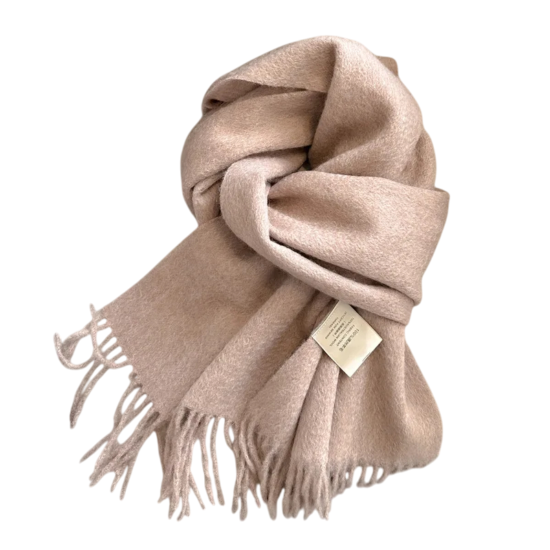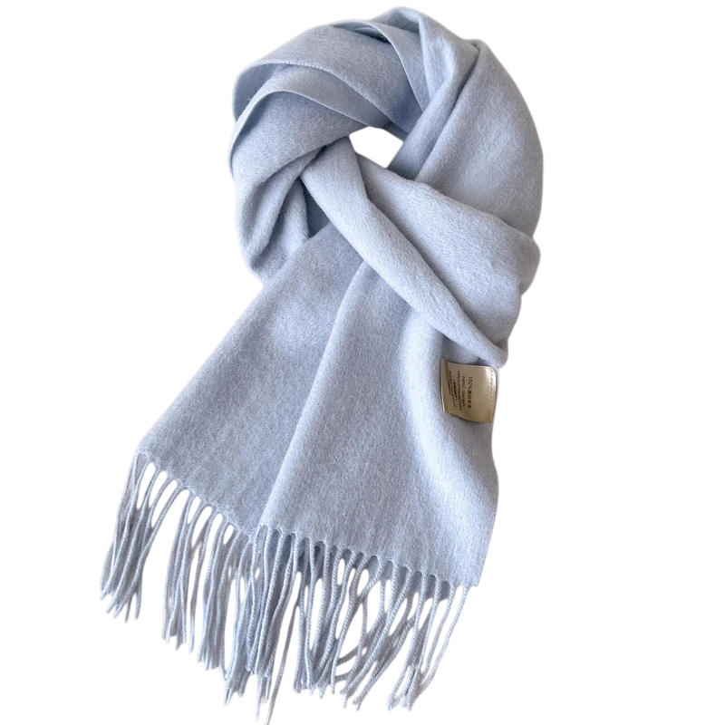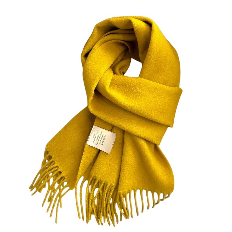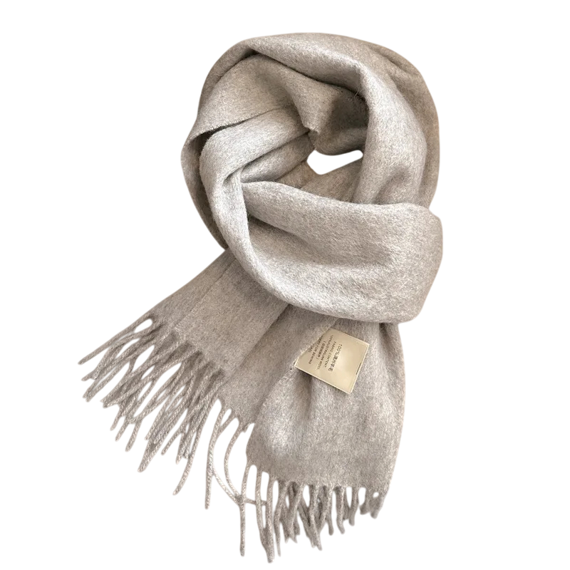 Cachecol feminino de lã lisa com comprimento de 135–175 cm e pontas desfiadas suaves. Aquece, é macio e confortável para o uso diário durante os meses frios. Descrição completa