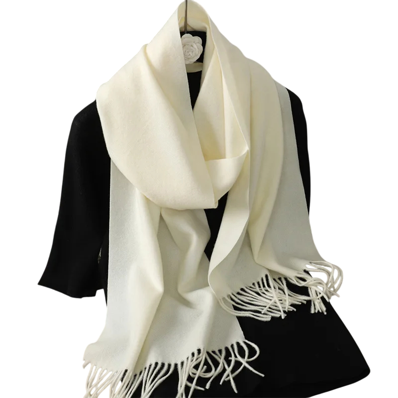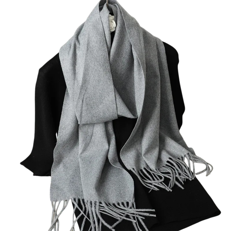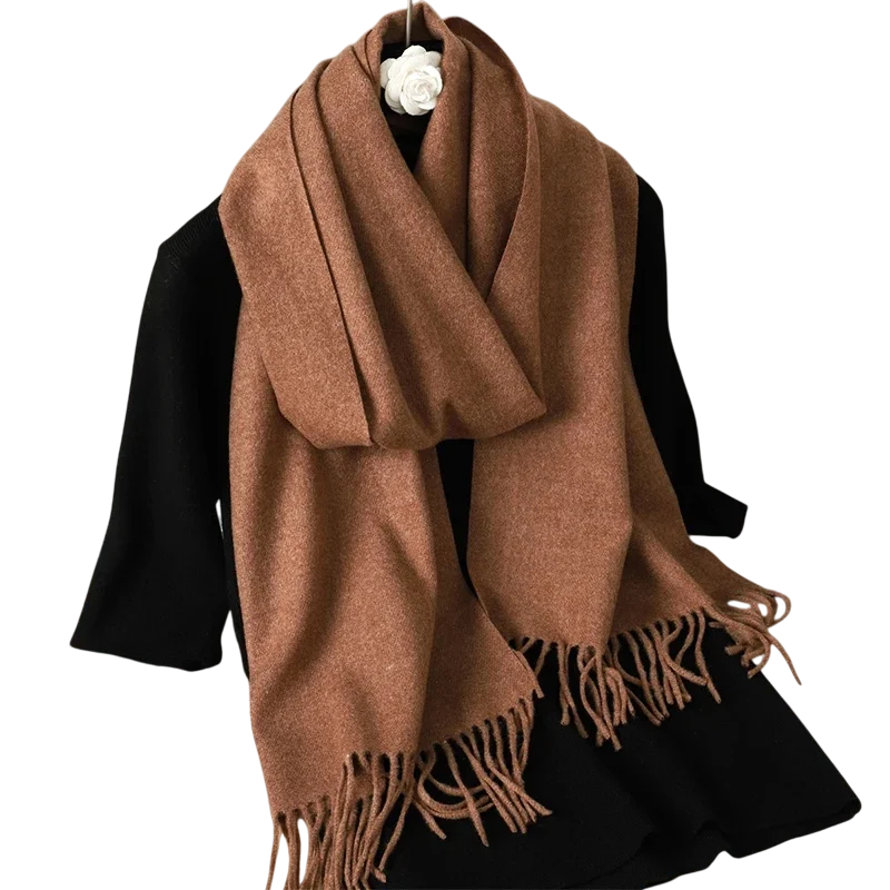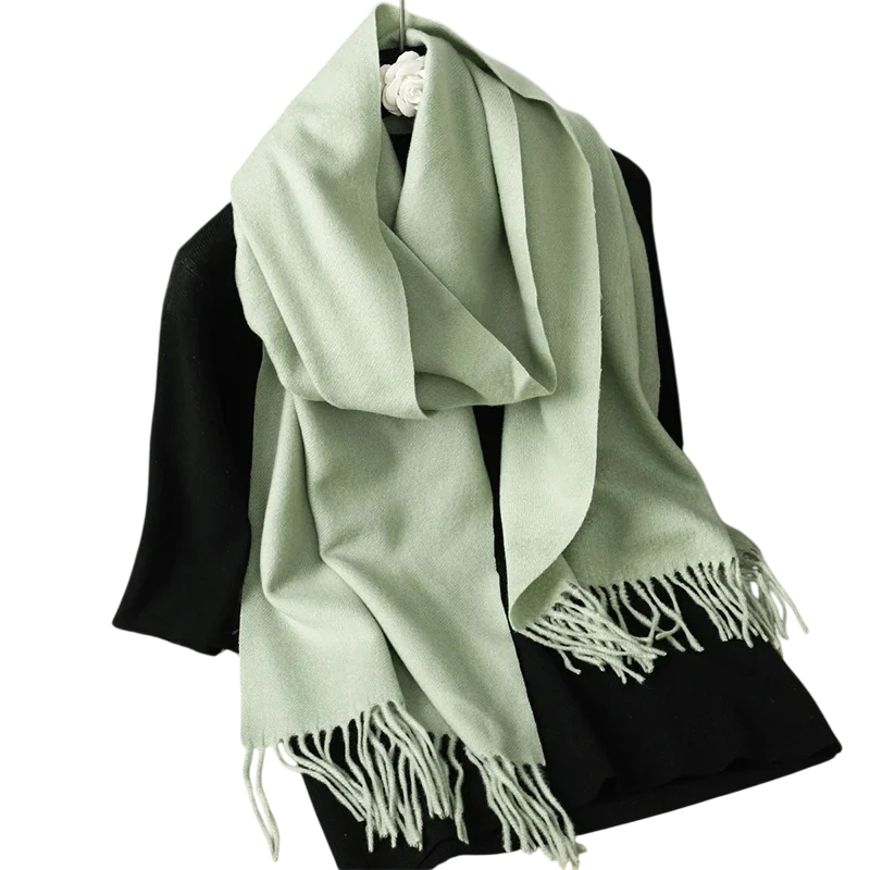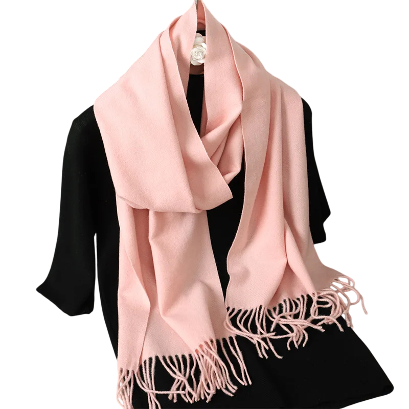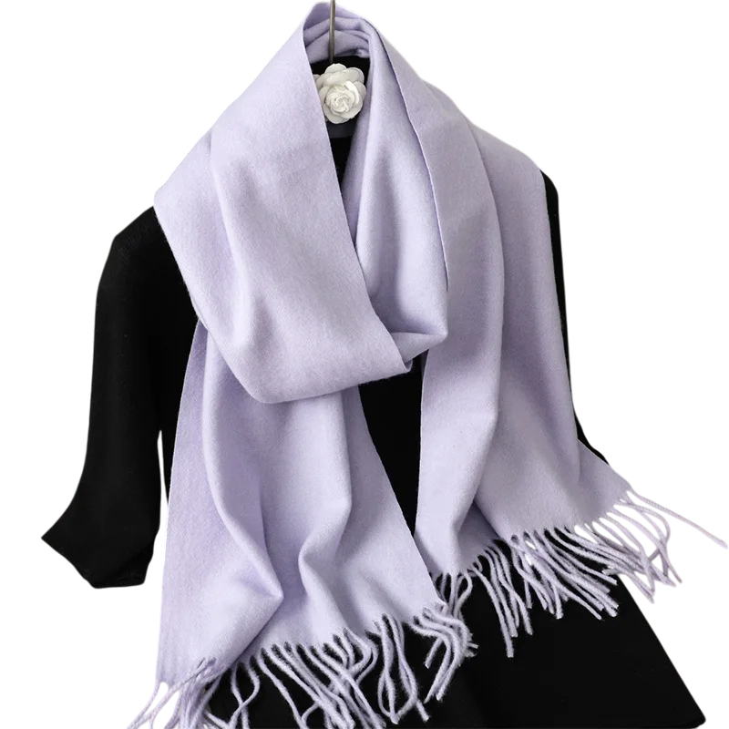 Cachecol feminino leve de cor sólida com franjas, com dimensões de 33x180 cm. Agradável ao toque, adequado para uso diário em dias frios. Descrição completa