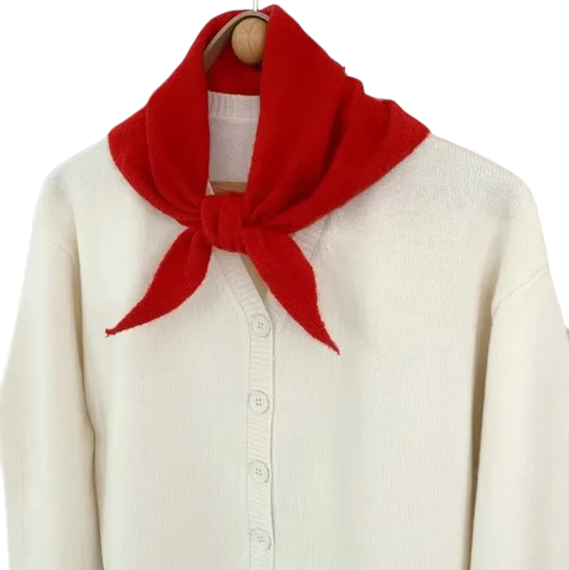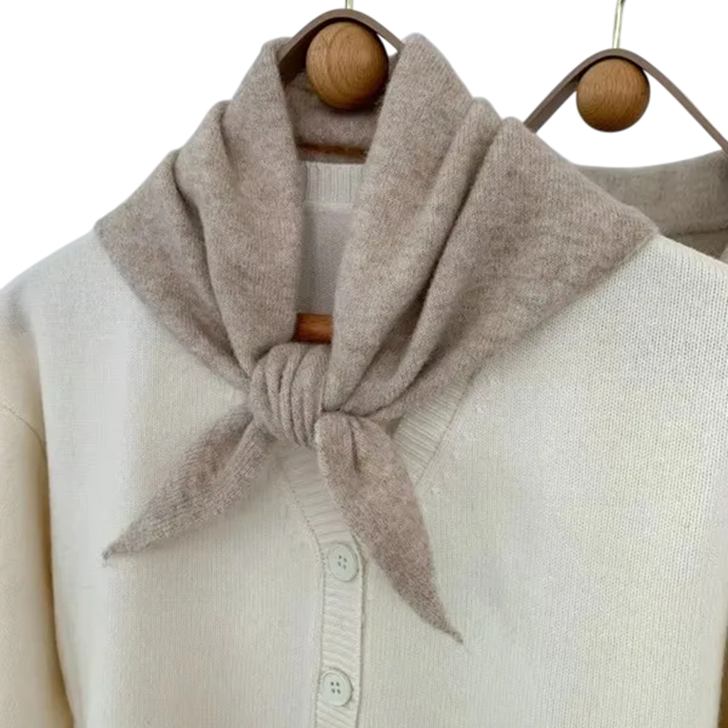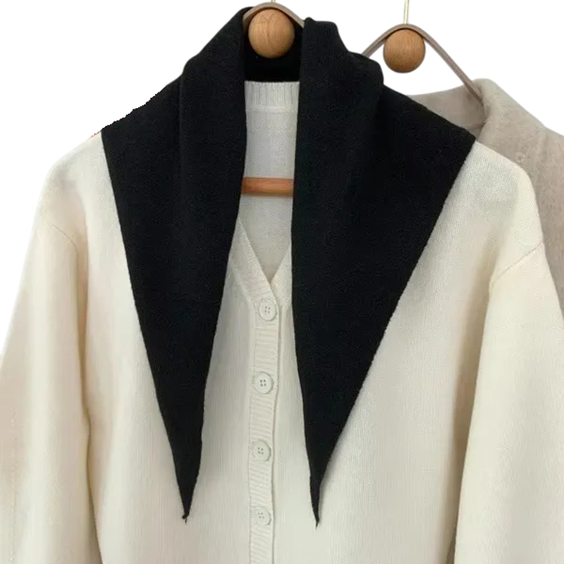 Cachecol feminino em forma de triângulo feito de uma combinação de materiais macios e aquecidos, ideal para um uso elegante durante os dias de outono e inverno. Descrição completa
