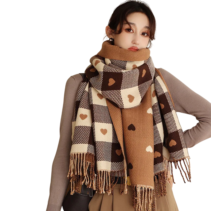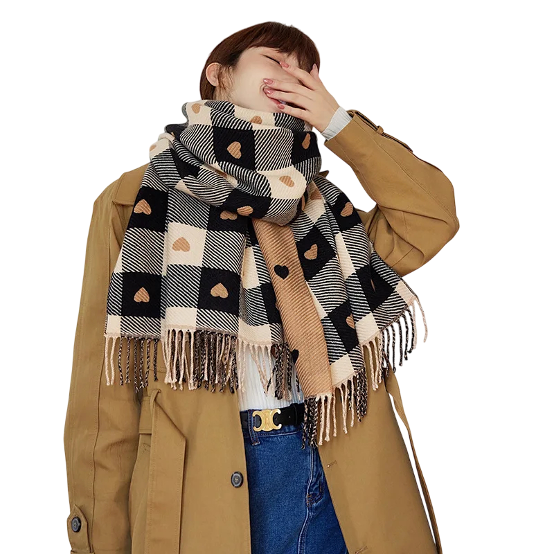 Cachecol Feminino em Poliéster com Padrão Simples de Xadrez e Corações e Pontas Franjadas Acessório de Moda Elegante e Aconchegante Cachecol Estiloso e Confortável para Uso Diário